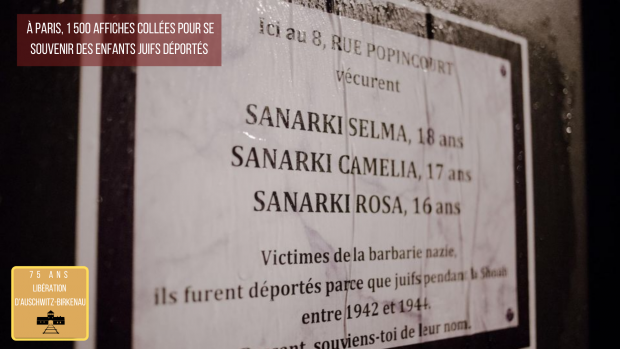 «Passant, souviens-toi de leur nom.» Celui des milliers d’enfants «victimes de la barbarie nazie», immortalisés par les affiches commémoratives apposées, dimanche soir, sur des façades d’immeubles parisiens d’où ils ont été raflés… A l’occasion du 75e anniversaire de la libération du camp d’Auschwitz-Birkenau, une soixantaine de jeunes de l’Union des étudiants juifs de France (UEJF) ont collé sur ces murs les noms, prénoms et âges des enfants, à leurs anciennes adresses. Certaines rues ont disparu, comme la rue Corbeau, désormais Louvel-Tessier, où une quarantaine d’enfants ont été raflés pendant l’occupation nazie. D’autres habitations se sont transformées en commerces, écoles ou crèches. Sur les murs de l’hôpital Rothschild, l’essentiel des enfants dont on peut lire le nom n’avaient même pas un an quand ils ont été envoyés dans les camps de la mort.