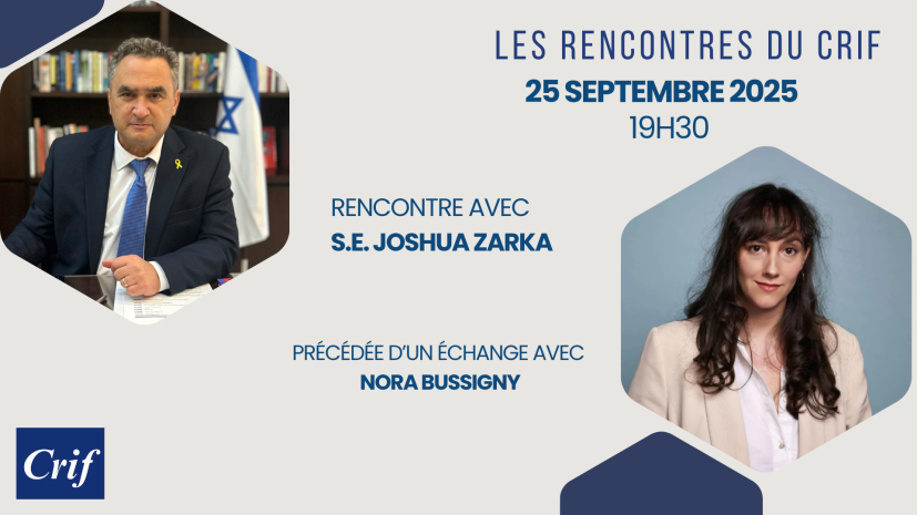 Jeudi 25 septembre 2025, les Amis du Crif vous proposent une rencontre avec l'Ambassadeur d'Israël en France, S.E. Joshua Zarka. La rencontre sera précédée d'un échange avec Nora Bussigny, journaliste d'investigation et autrice qui présentera son dernier ouvrage « Les Nouveaux Antisémites » (Éditions Albin Michel, septembre 2025).