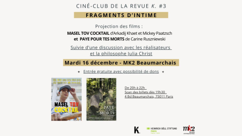 Mardi 16 décembre 2025, La Revue K vous invite à une séance gratuite du Ciné-Club K. Les films « Masel Tov Cocktail » d’Arkadij Khaet et Mickey Paatzsch, et « Paye pour tes morts » de Carine Ruszniewski, seront projetés. La projection se fera en présence des réalisateurs et sera suivie d'une discussion avec la philosophe Julia Christ.