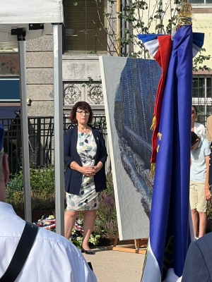 Ensuite, Madame Francine Mayran, artiste et enseignante, a présenté une œuvre réalisée pour retracer l’atrocité de cette rafle sur la base de la seule photo existante des bus devant l’entrée du vélodrome.