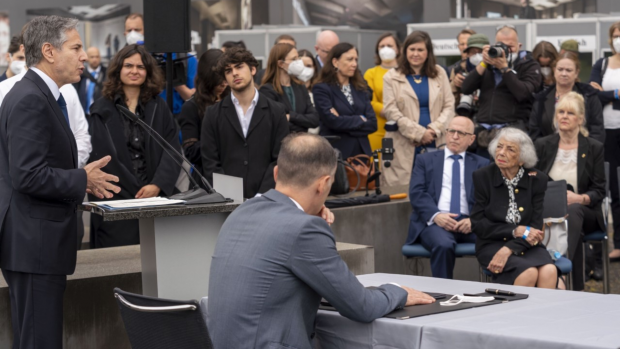Le secrétaire d'État américain Antony Blinken, le ministre allemand des Affaires étrangères Heiko Maas et plusieurs survivants de la Shoah étaient présents pour le lancement au Mémorial des Juifs assassinés d'Europe à Berlin.