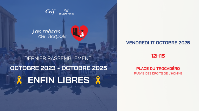 Depuis plus de deux ans, les Mères de l’Espoir, soutenues par le Crif et la Wizo, se réunissent chaque vendredi Place du Trocadéro à Paris pour appeler à la libération des otages. Le vendredi 17 octobre 2025, alors que tous les otages encore en vie ont retrouvé la liberté, les Mères de l’Espoir se rassembleront pour la dernière fois sur cette même place.