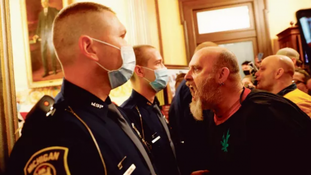 Dans plusieurs cas, les appels à manifester lancés sur Facebook émanaient d’individus liés à des franges plus extrémistes. L’une des organisations antiquarantaine, American Revolution 2.0, se présente comme un rassemblement de citoyens en colère, dans la lignée du mouvement du Tea Party. Mais son fondateur, Josh Ellis, un entrepreneur de Chicago, entretient des liens avec des activistes notoires, notamment avec le mouvement des Three Percent, groupe paramilitaire d’extrême droite, ainsi baptisé en souvenir des 3 % d’Américains à avoir pris les armes contre la couronne britannique au début de la guerre d’Indépendance au XVIIIe siècle.