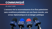 Jeudi 24 juillet 2025, le président de la République a annoncé que la France allait reconnaître, en septembre, un État de Palestine sur ses réseaux sociaux. «Fidèle à son engagement historique pour une paix juste et durable au Proche-Orient, j’ai décidé que la France reconnaîtra l’Etat de Palestine. J’en ferai l’annonce solennelle à l’Assemblée générale des Nations unies, au mois de septembre prochain », écrit Emmanuel Macron sur X et Instagram. L'annonce de la reconnaissance d'un État palestinien en septembre sans conditions préalables est une faute morale, une erreur diplomatique et un danger politique.